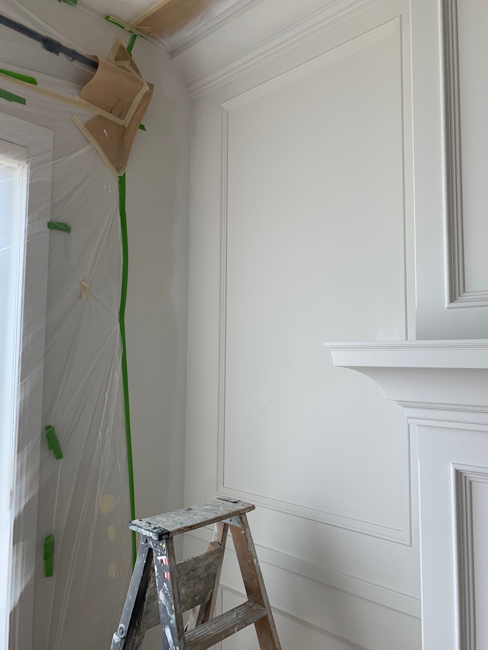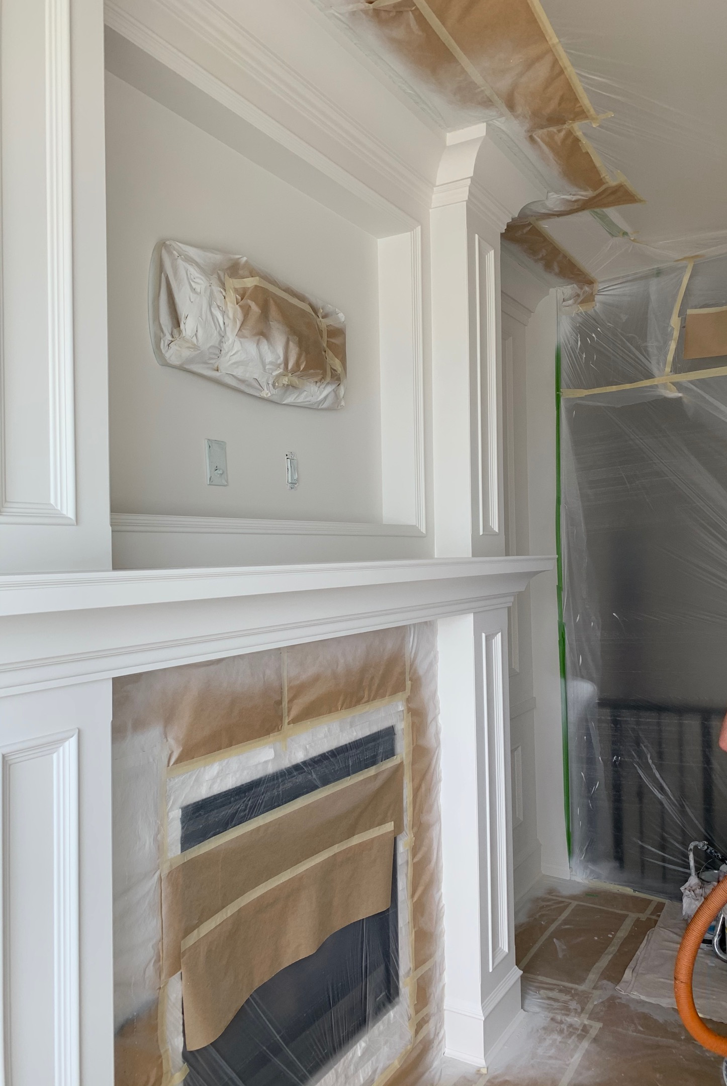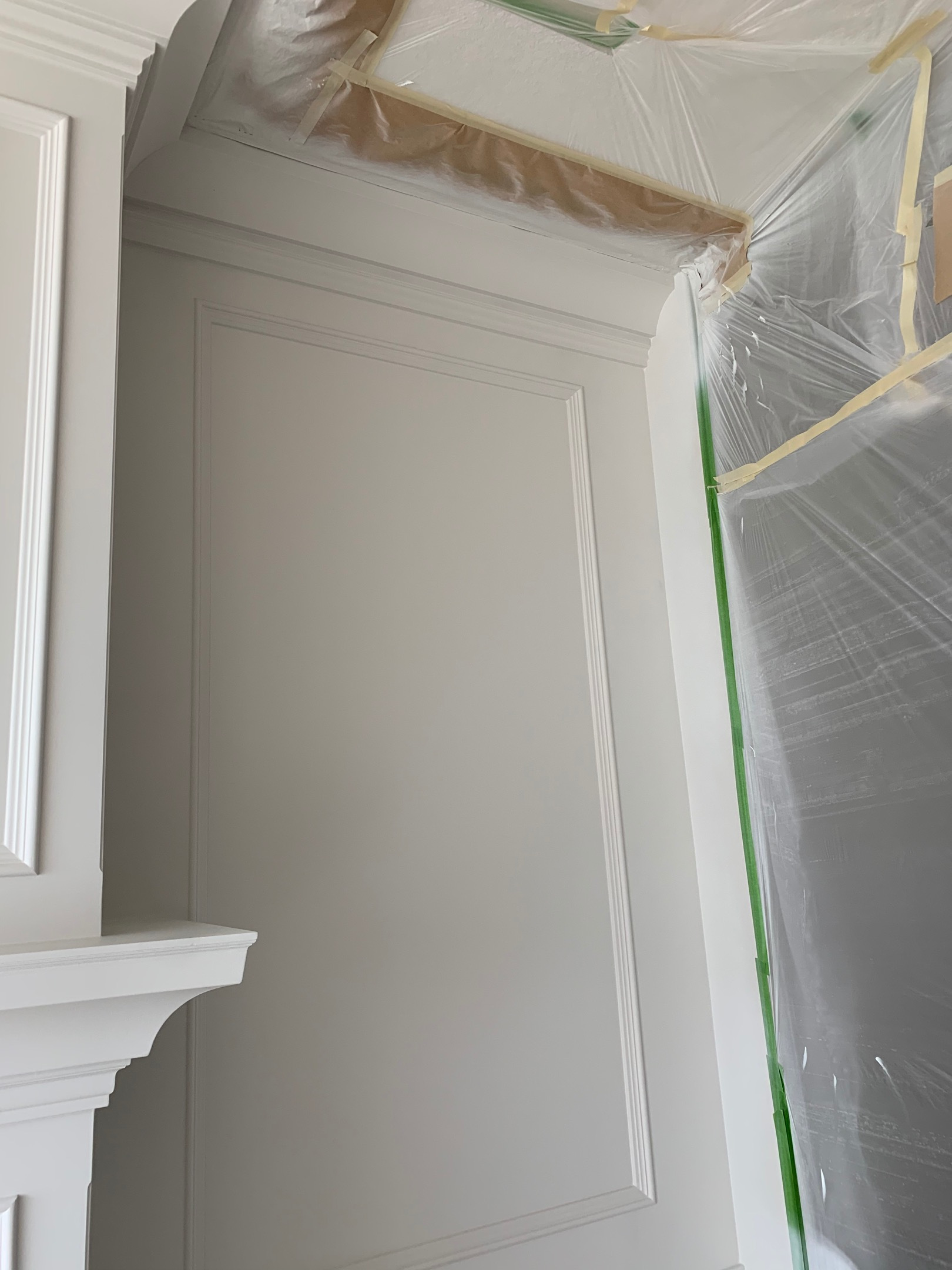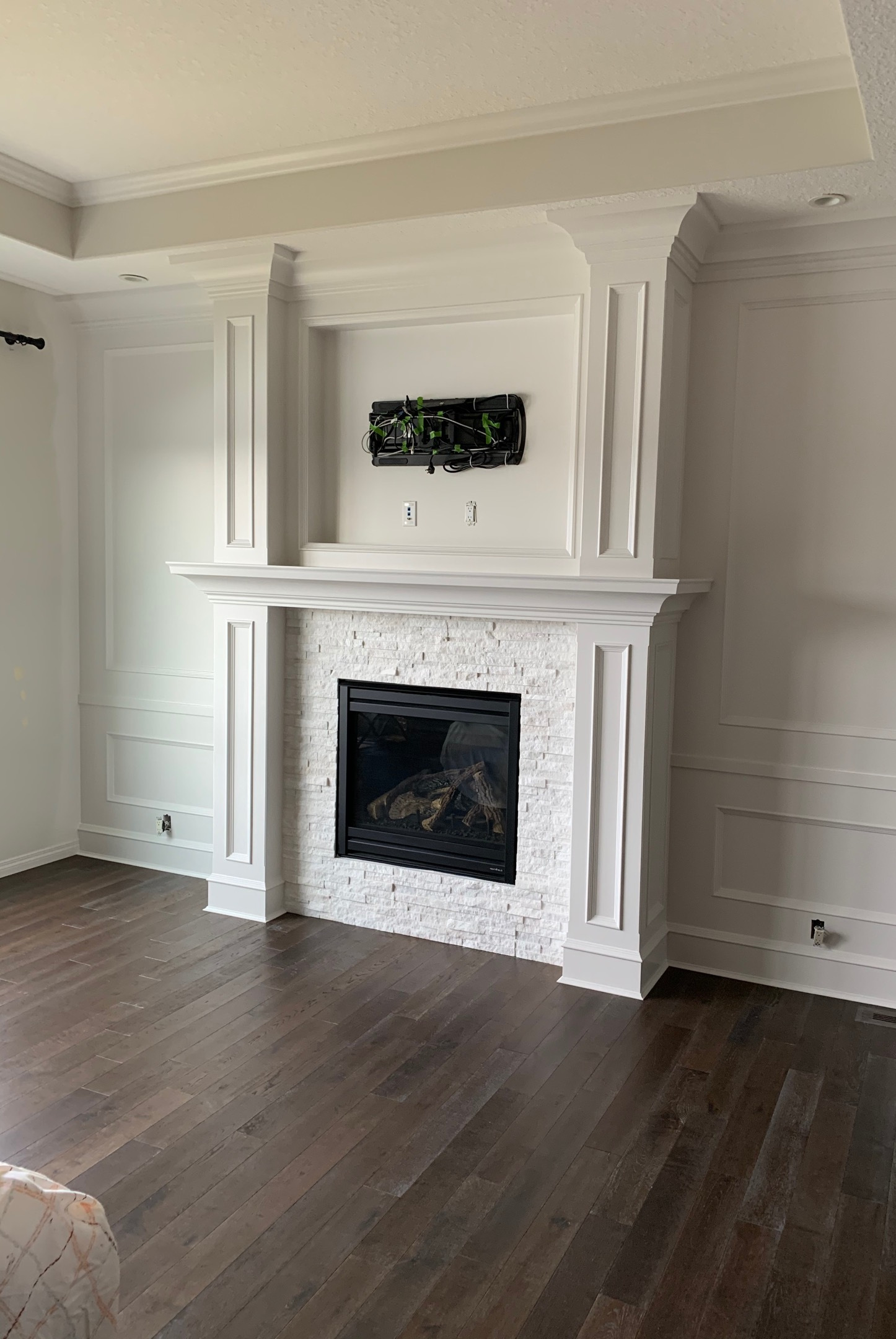 Refinishing of fireplace/TV area with full wall paneling and crown molding.